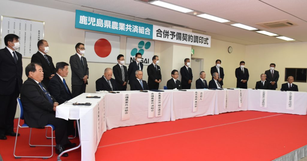 令和2年10月2日にNOSAI連鹿児島において、「鹿児島県農業共済組合合併予備契約調印式」を行いました。鹿児島県の満薗農政部長と県農業共済組合連合会長を立会人に県内7組合の組合長と1事務組合の管理者(朝山 奄美市長)が合併予備契約を締結いたしました。